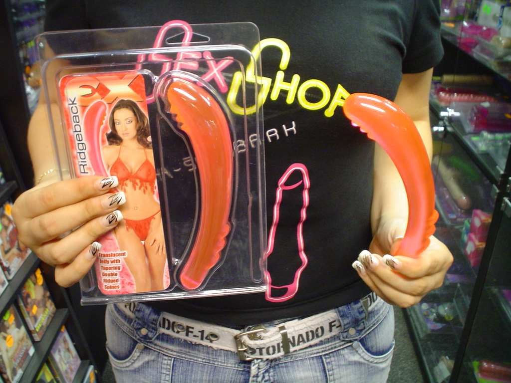 Priesvitný, umelý penis, ktorý je zašpicatený do dvoch hřebenovitých ostňov.