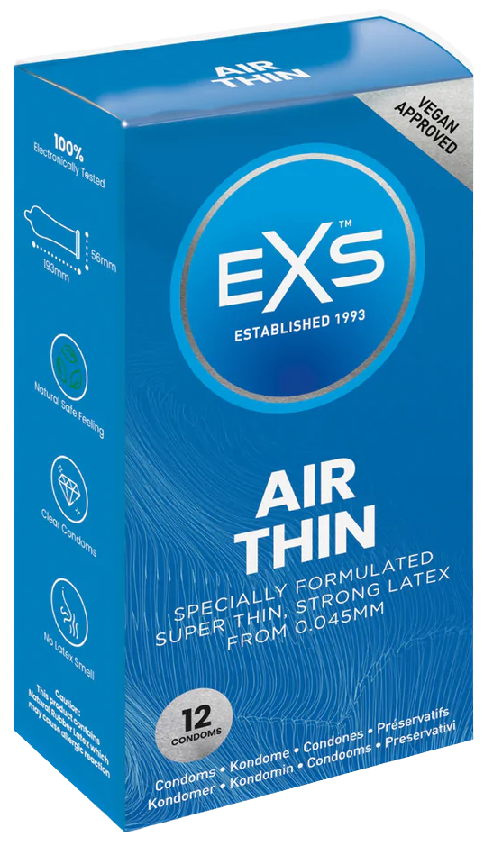 EXS Air Thin kondómy sú navrhnuté pre tých, ktorí hľadajú maximálnu citlivosť a prirodzený pocit počas intímnych chvíľ. Vďaka extrémne tenkej stene s hrúbkou iba 0,045 mm poskytujú pocit, akoby ste žiadny kondóm nemali, a pritom si zachovávajú pevnosť a spoľahlivosť bežných latexových kondómov. Kondómy nemajú typický zápach latexu, čo zvyšuje komfort pri používaní. Sú testované podľa najprísnejších európskych štandardov a certifikované Britským inštitútom štandardov (BSI), čo zaručuje ich kvalitu a bezpečnosť.