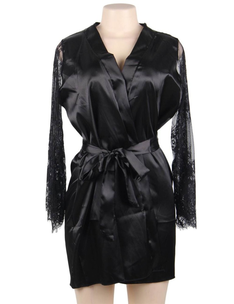 Eyelash Lace Nightdress Silk Long Sleeves Black Sleepwear with G String XS-S