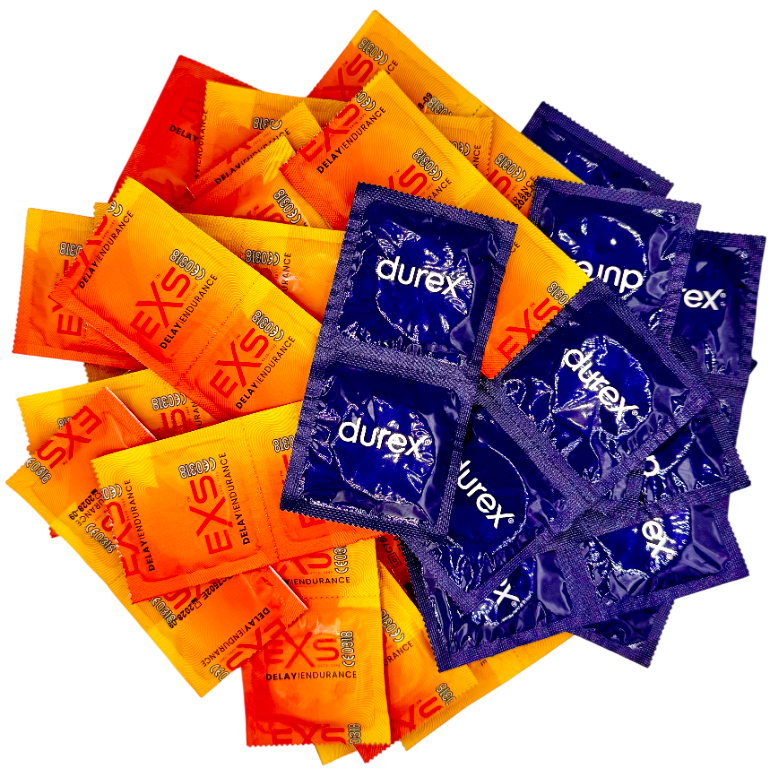 Súprava znecitlivujúcich kondómov Delay pack pomôže mužom oddialiť vyvrcholenie, aby mohli svojej partnerke dopriať vytúžený orgazmus. Hrčkovité kondómy Durex Mutual obsahujú 5 % benzokaínu, ultratenké kondómy EXS Delay znecitlivujú penis 1 % lidokaínu. Muži môžu otestovať, ktorá účinná látka na nich pôsobí lepšie. Páni, trpíte predčasnou ejakuláciou, potrebujete predĺžiť svoju výdrž alebo jednoducho chcete zažiť dlhšiu hru s partnerkou? So sadou znecitlivujúcich kondómov budete vo forme.